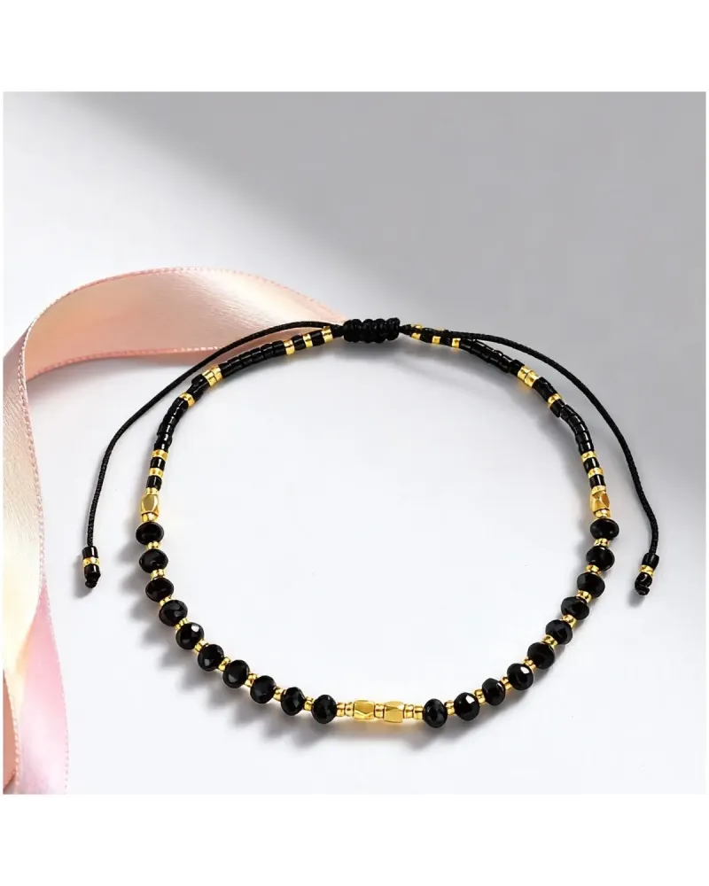 Stylowa bransoletka wykonana z drobnych koralików to wyjątkowy dodatek inspirowany modą boho. Połączenie czarnych koralików z subtelnymi złotymi akcentami tworzy elegancką, a jednocześnie lekką kompozycję, która doskonale uzupełnia zarówno codzienne stylizacje, jak i bardziej wyraziste zestawy.