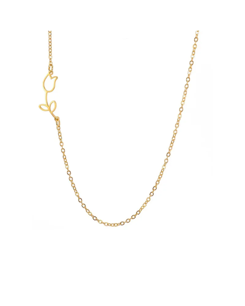Subtelny kontur tulipana zatopiony w złotej stali przyciąga wzrok minimalistyczną formą i kobiecym charakterem. Naszyjnik stalowy złoty – kwiatek [BM033] to biżuteria, która stawia na prostotę i lekkość, nie rezygnując przy tym z wyrazistości. Motyw kwiatu został umieszczony asymetrycznie względem łańcuszka, co nadaje kompozycji świeżości i oryginalności, zachowując równocześnie równowagę między nowoczesnością a klasyczną symboliką.