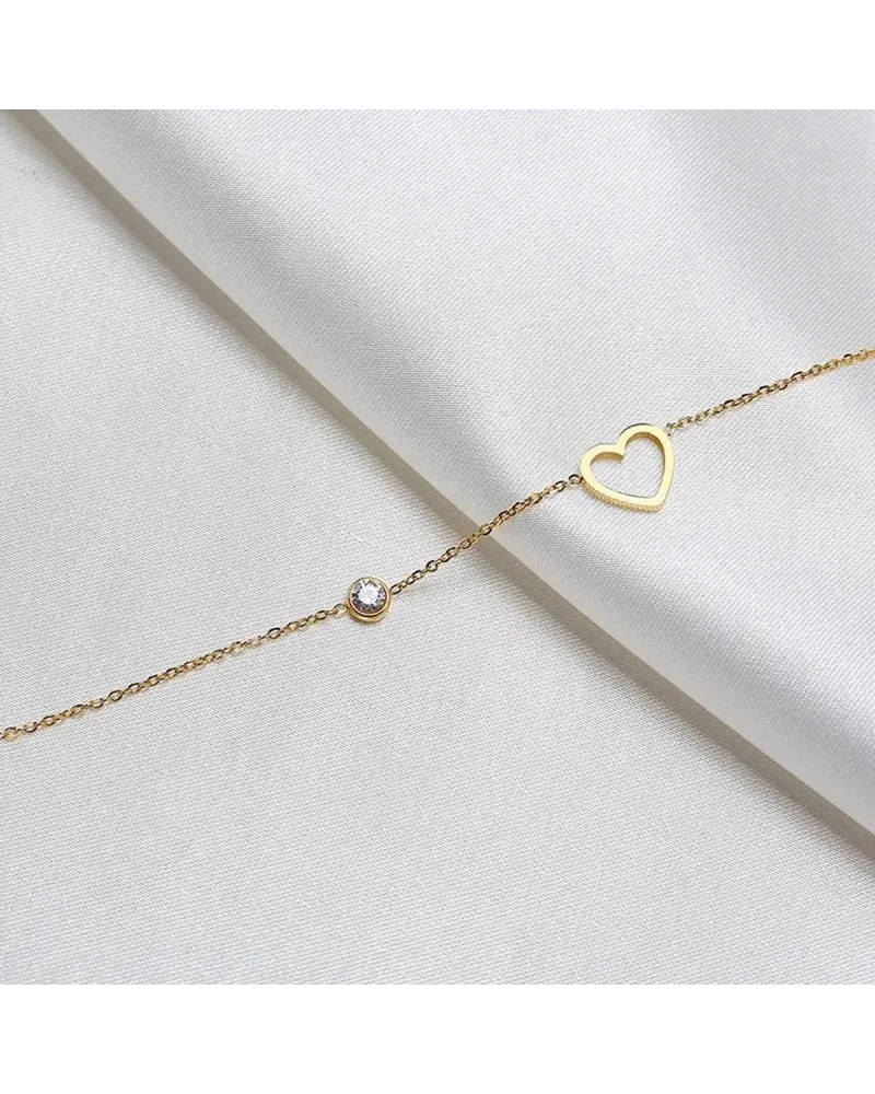 Cienki, złoty łańcuszek wykonany ze stali nierdzewnej został uzupełniony o dwa subtelne elementy: ażurową zawieszkę w kształcie serca oraz drobny kryształ, który delikatnie odbija światło. Całość tworzy harmonijną kompozycję o kobiecym, nowoczesnym charakterze.