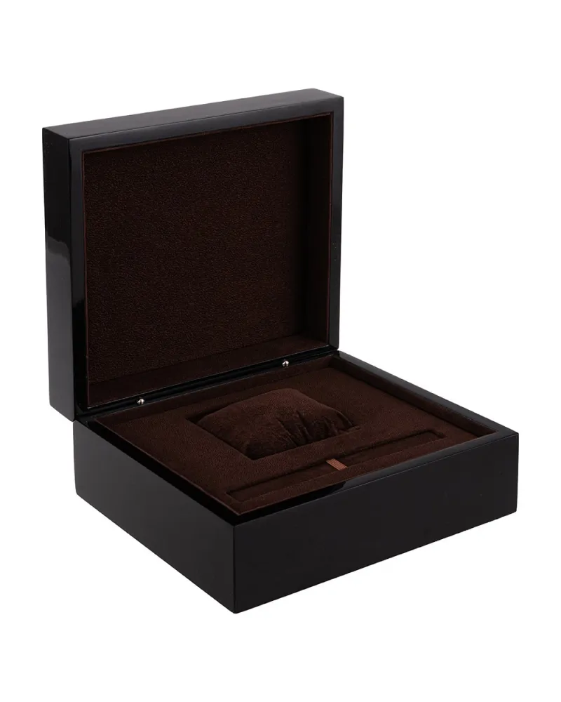 Pudełko prezentowe o zdecydowanie luksusowym charakterze, wykonane z drewna lakierowanego na wysoki połysk. Gładka, czarna powierzchnia zewnętrzna odbija światło niczym politura – bez ozdobników, bez zbędnych detali. Elegancja w najczystszej formie. Prosta forma sześciennej bryły skrywa w środku wyrafinowane, funkcjonalne wnętrze, w którym można umieścić dwa różne elementy – pióro lub długopis oraz zegarek lub inny dodatek biżuteryjny.