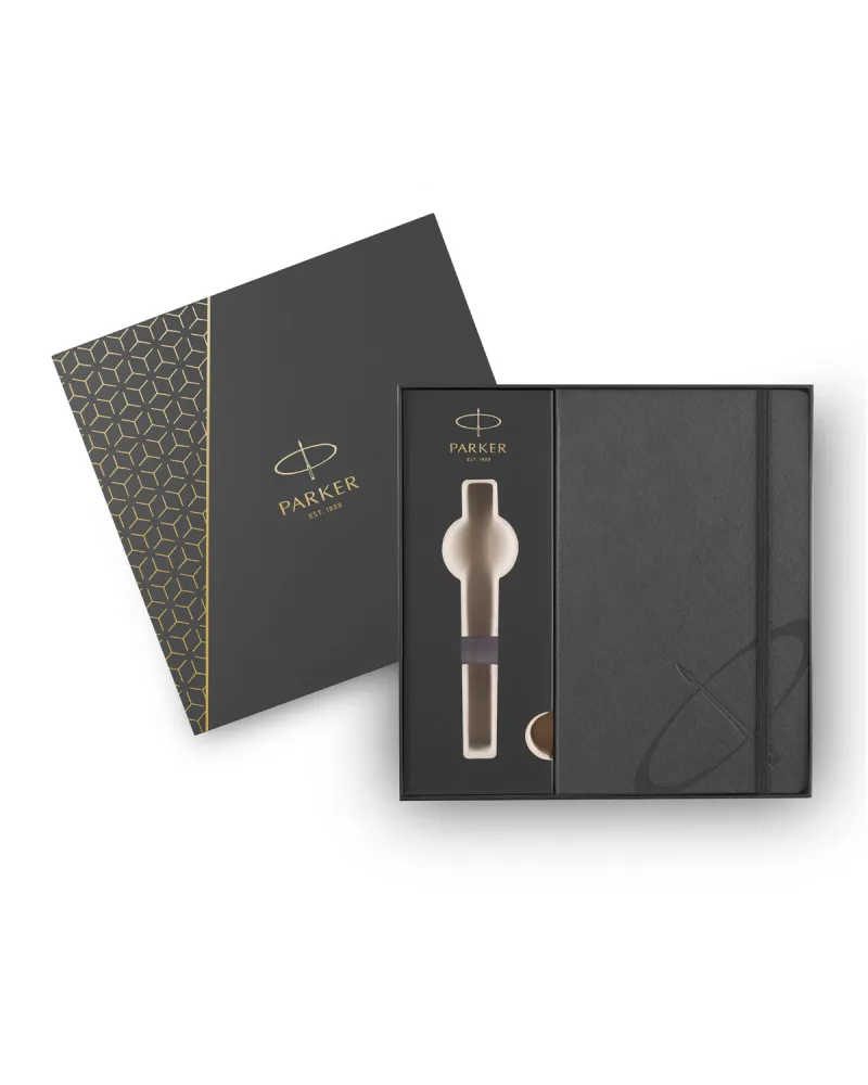 W skład zestawu wchodzi czarny, twardy notes z gumką zamykającą, który wpisuje się w nowoczesną estetykę minimalistycznych akcesoriów biurowych. Okładka notesu została ozdobiona tłoczonym motywem inspirowanym logotypem Parker, co subtelnie podkreśla jego pochodzenie i jakość. Sam notes zachowuje klasyczny układ: elastyczne zamknięcie, wewnętrzną kieszonkę na dokumenty oraz miejsce na długopis – całość została dopasowana tak, by spełniać wymagania zarówno profesjonalistów, jak i miłośników starannie prowadzonych notatek.