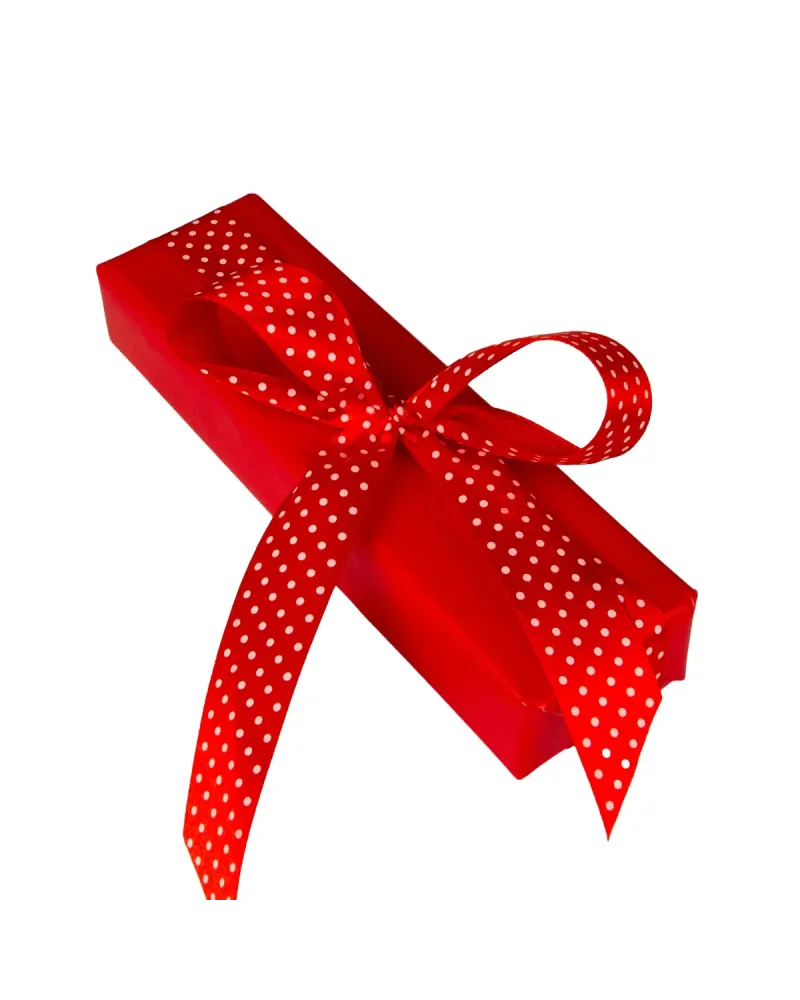Stylowe opakowanie, które łączy klasyczną elegancję z subtelnym, dekoracyjnym akcentem. Intensywnie czerwone pudełko przewiązane wstążką w delikatne białe groszki tworzy ponadczasowy i estetyczny wygląd – idealny na wiele okazji.