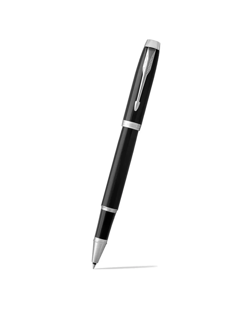 Pióro kulkowe Parker IM czarne CT wyróżnia się błyszczącym lakierem i chłodnymi, chromowanymi detalami. Ujęcie packshot podkreśla smukły, nowoczesny charakter modelu.