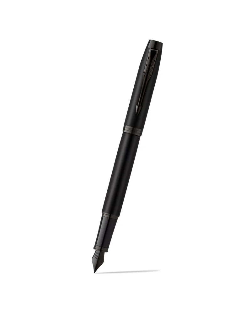Pióro wieczne Parker IM Achromatic Black w pełnej, matowej czerni. Stalówka, klips i wszystkie detale zostały pokryte czarną powłoką PVD, tworząc konsekwentny, minimalistyczny projekt.