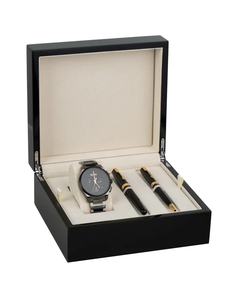 Ten zestaw nie próbuje być efektowny za wszelką cenę. Jego siła tkwi w konsekwencji – w tym, że każdy element mówi tym samym językiem. Zegarek, długopis i pióro tworzą razem przemyślaną całość, która nie potrzebuje dodatkowych argumentów. Wystarczy jedno spojrzenie, żeby zrozumieć, z czym mamy do czynienia.