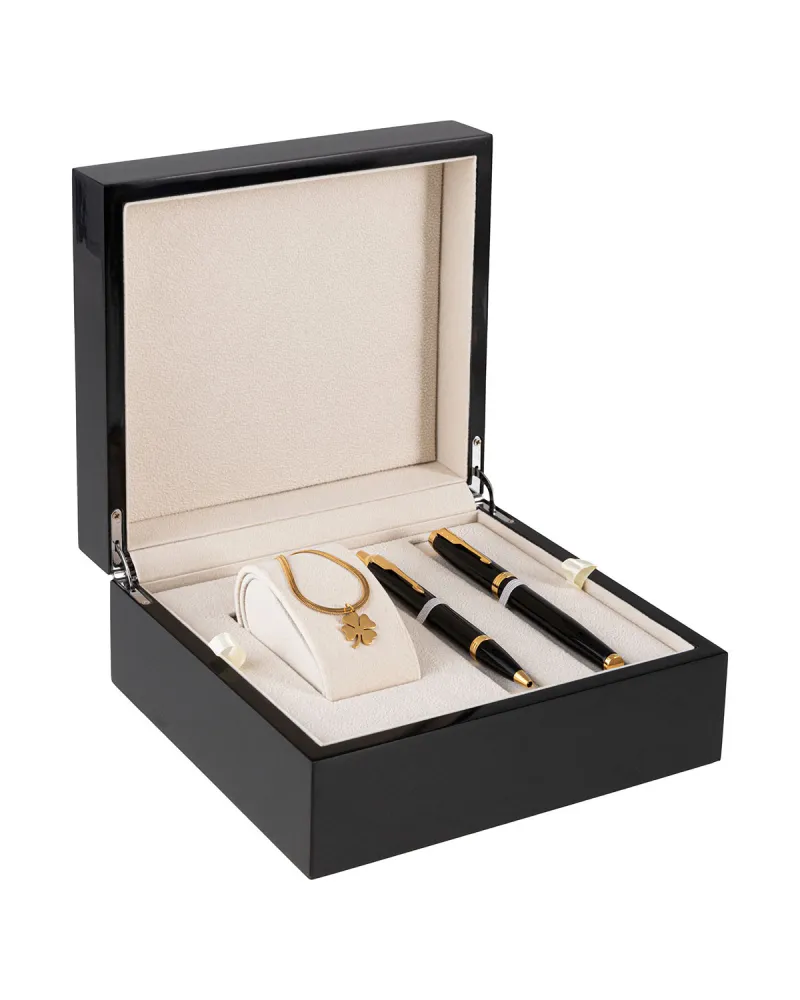 Ten komplet jednak zyskuje pełnię wyrazu dopiero wtedy, gdy spojrzymy na naszyjnik. Wykonany ze stali szlachetnej, pokryty złotym wykończeniem, stanowi spójną kontynuację estetyki pióra i długopisu. Zawieszka w formie czterolistnej koniczyny nie jest tylko elementem dekoracyjnym – niesie symbolikę, której trudno odmówić znaczenia. Szczęście, pomyślność, dobra energia – wszystko to zaklęte w drobnym, ale zauważalnym detalu, który może mieć dla obdarowanej osoby realną wartość emocjonalną.