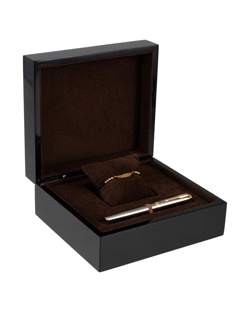 Czarne pudełko z wnętrzem wyłożonym miękkim materiałem kontrastuje z jasnym wykończeniem pióra i złotymi detalami bransoletki, tworząc efektowną, ale uporządkowaną kompozycję wizualną. Taka forma prezentacji nie wymaga zbędnych dodatków – wszystko, co istotne, znajduje się w środku. Całość nie tylko prezentuje się profesjonalnie, ale też wzbudza zaufanie do jakości i trwałości wybranych przedmiotów.