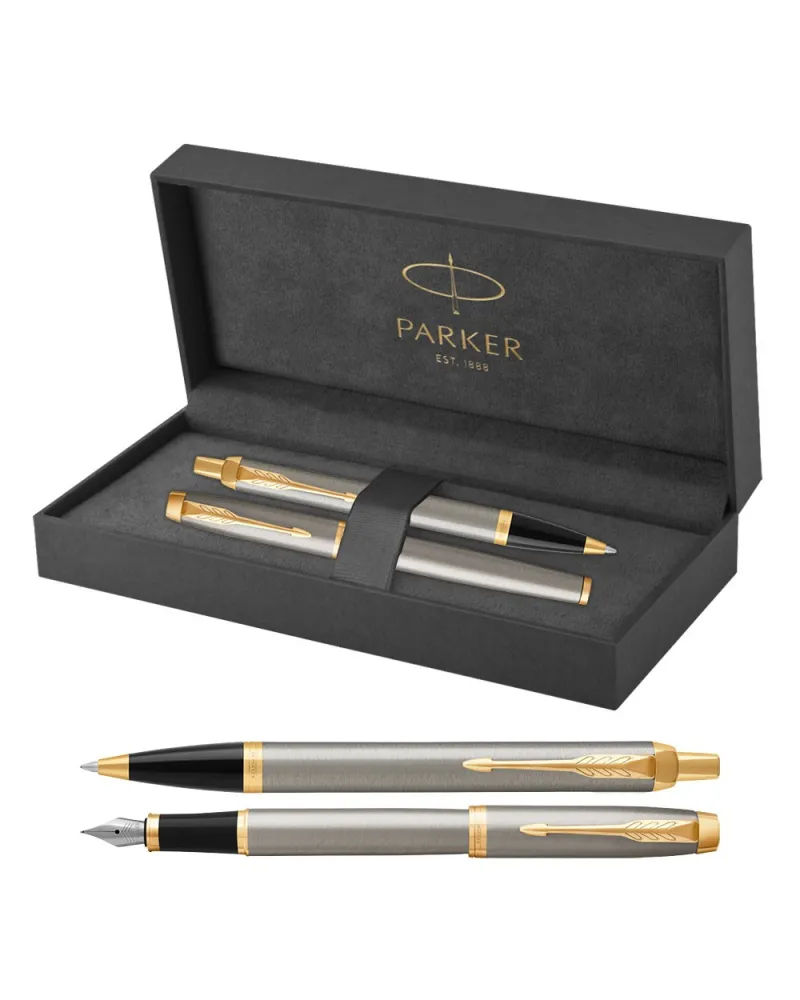 Zestaw Parker IM Brushed Metal GT łączy w sobie dopracowane rzemiosło i dyskretną elegancję. Zarówno pióro wieczne, jak i długopis wykonano z metalu o szczotkowanej strukturze, który nadaje powierzchni głębi i charakteru. Odcień stali – chłodny i surowy – kontrastuje tu z detalami w kolorze złota, tworząc spójną i ponadczasową kompozycję. Zestaw prezentuje się profesjonalnie, nie epatując przesadą, ale przyciągając uwagę szlachetną prostotą i wysoką kulturą wykonania.