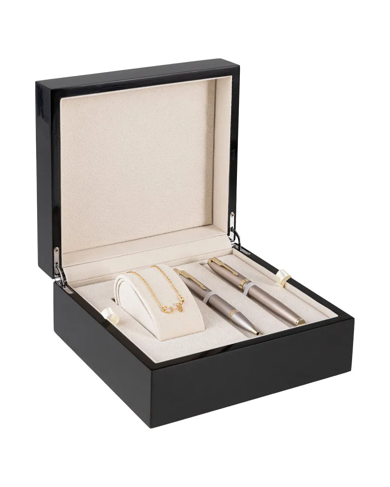 Zestaw zapakowano w solidne, lakierowane pudełko z miękkim wnętrzem, w którym każdy element ma swoje wyraźnie wyznaczone miejsce. W efekcie powstała kompozycja, która łączy w sobie użyteczność, estetykę i wyrafinowaną prostotę.