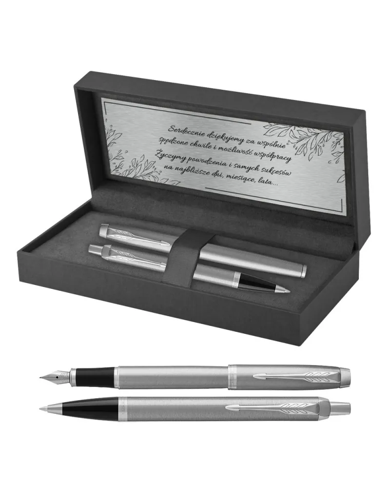 Podsumowując, zestaw Parker IM Stainless Steel CT w pudełku z grawerem to wybór, który łączy w sobie elegancję, trwałość i indywidualny wymiar. Wręczony na pożegnanie w pracy staje się nie tylko eleganckim upominkiem, ale też osobistym symbolem wdzięczności. To pamiątka, która pozostaje z obdarowanym na dłużej niż jakiekolwiek słowa – przypominając o wspólnie spędzonych chwilach i budując most między tym, co było, a tym, co dopiero nadejdzie.