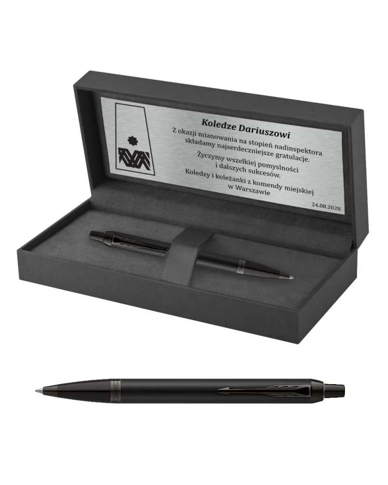 Długopis Parker IM Achromatic Czarny w eleganckim pudełku – pełna matowa czerń i tabliczka z grawerem podkreślają formalny charakter prezentu.
