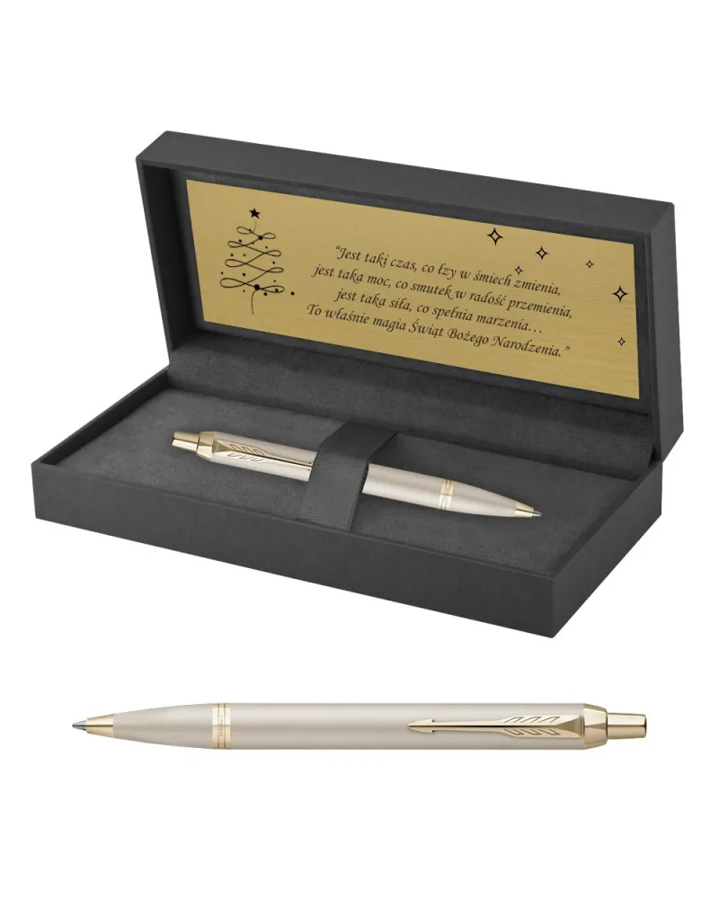 Długopis Parker IM Monochrome Champagne w pudełku z grawerem to połączenie tradycji i nowoczesności – propozycja, która nie narzuca się przesadnym blaskiem, a jednocześnie wyróżnia się na tle innych upominków. To wybór świadomy, elegancki i uniwersalny – dokładnie taki, jaki powinien być gest gratulacji czy podziękowania.