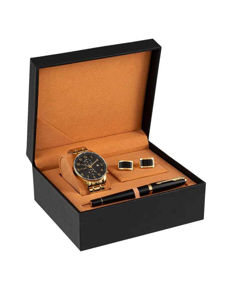 Drugim filarem zestawu jest zegarek Paul Lorens PL20002B-1D1. To model utrzymany w tonacji złota z czarną tarczą, co sprawia, że doskonale komponuje się z estetyką pióra. Stalowa bransoleta w odcieniu złota podkreśla klasyczny charakter czasomierza, a kontrastowa tarcza z wyraźnymi indeksami i subtarczami nadaje mu dynamicznego rysu. Zegarek nie jest jedynie dodatkiem – to narzędzie codzienne, które łączy w sobie włoski sznyt, precyzyjny mechanizm Miyota i detale nawiązujące do współczesnych trendów. Chronograf, datownik i solidne szkło mineralne sprawiają, że czasomierz jest zarówno elegancki, jak i funkcjonalny. W kontekście całego zestawu pełni rolę elementu nowoczesnej klasyki – dyskretnego, ale stanowczego akcentu, który uzupełnia styl użytkownika.