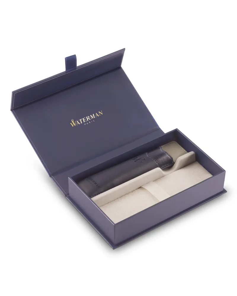 Etui wykonane ze skóry syntetycznej jest lekkie, trwałe i łatwe do utrzymania w czystości. Sprawdzi się jako codzienne zabezpieczenie pióra lub długopisu, zarówno w torbie, jak i w aktówce. Pudełko z zestawem nie zawiera produktu piśmienniczego – stanowi osobne, neutralne opakowanie, gotowe do uzupełnienia wybranym modelem z kolekcji Waterman.