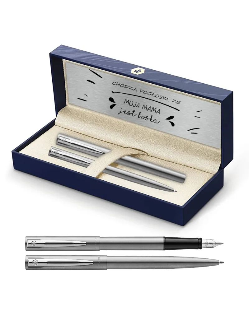 Są chwile, w których warto wyjść poza klasyczne bukiety czy czekoladki i podarować mamie coś, co na długo zostanie z nią każdego dnia. Zestaw złożony z długopisu i pióra wiecznego Waterman Allure w srebrnym wykończeniu to właśnie taka propozycja – praktyczna, ale niebanalna, elegancka, a przy tym pełna osobistego znaczenia. Starannie oprawiony w granatowe pudełko z jasnym wnętrzem, z dołączoną tabliczką z dedykacją „Chodzą pogłoski, że moja mama jest boska”, staje się gotowym upominkiem, który nie wymaga dodatkowych wyjaśnień.