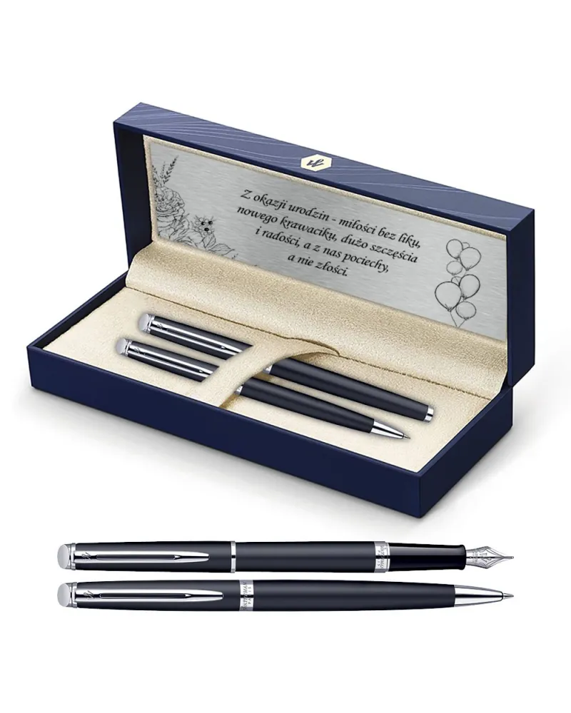 Styl, który przemawia ciszą. Precyzja, która nie potrzebuje reklamy. Urodzinowy zestaw Waterman Hemisphere – w wersji czarnej matowej z chromowanymi akcentami – to wyważone połączenie elegancji i funkcjonalności, stworzone z myślą o osobach, które cenią dopracowane detale. Zestaw zawiera pióro wieczne oraz długopis – oba zaprojektowane tak, by wyrażać charakter właściciela bez zbędnych słów.