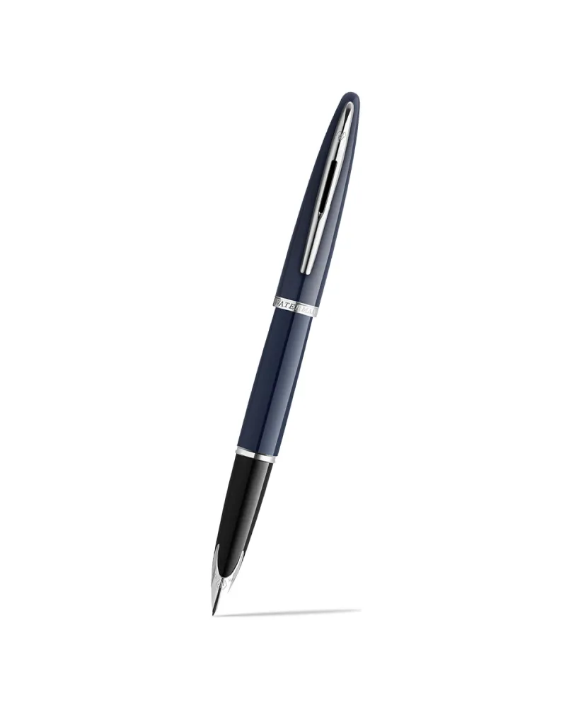Pióro wieczne Waterman Carene Blue Core CT w głębokim granacie z chromowanymi detalami, ukazane na ciemnym tle, podkreślającym jego opływową, jachtową formę.