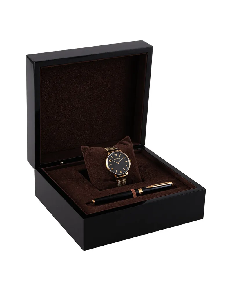 Zestaw oparty na wyrazistości formy i staranności wykonania. Pióro wieczne Waterman Hémisphère oraz zegarek Paul Lorens tworzą kompozycję, która łączy estetykę klasyczną z funkcjonalnością dopasowaną do codziennego użytku. Zaprezentowane razem w eleganckim pudełku, akcesoria te zachowują stylistyczną spójność dzięki harmonijnemu zestawieniu koloru czerni i złota oraz detali, które wyraźnie nawiązują do precyzyjnego rzemiosła.