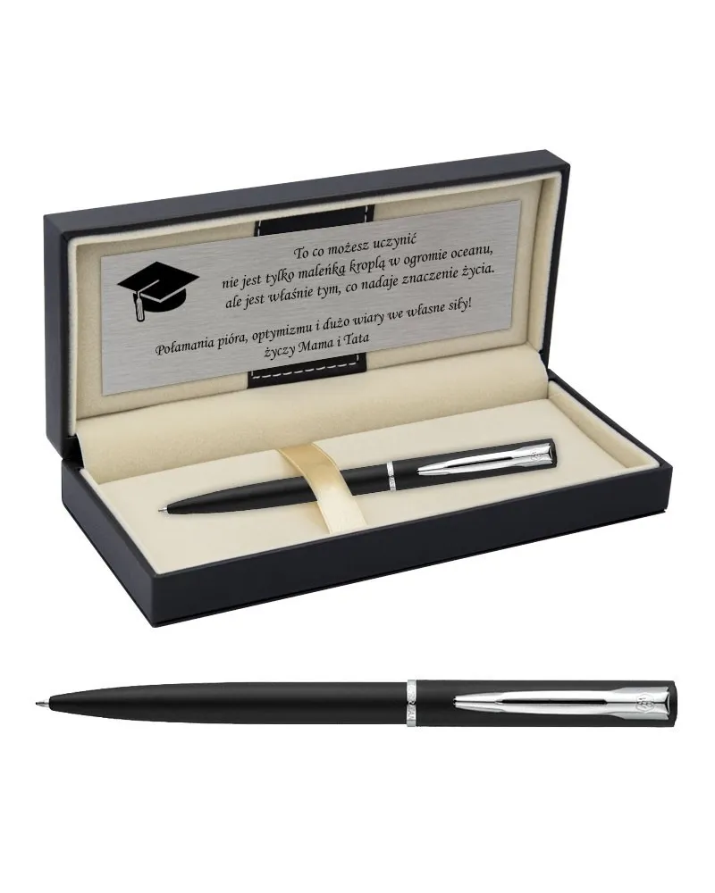 Nie każda pamiątka ma w sobie tak wiele znaczeń. Zestaw Waterman Graduate czarny CT z grawerem to klasyczny upominek z przesłaniem, który łączy elegancję wykonania z emocjonalnym przekazem. Wewnątrz pudełka znajduje się tabliczka z dedykacją: