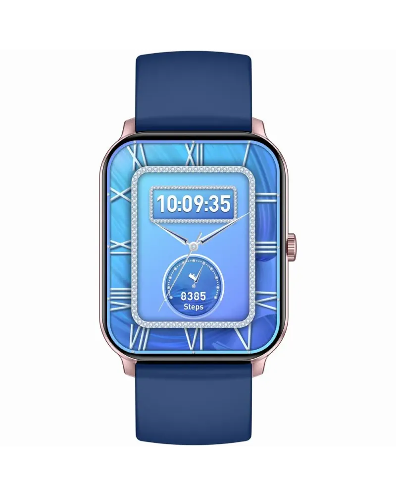 Elegancka koperta w odcieniu różowego złota oraz granatowy, wygodny pasek wyróżniają ten smartwatch na tle innych urządzeń, łącząc styl z funkcjonalnością.