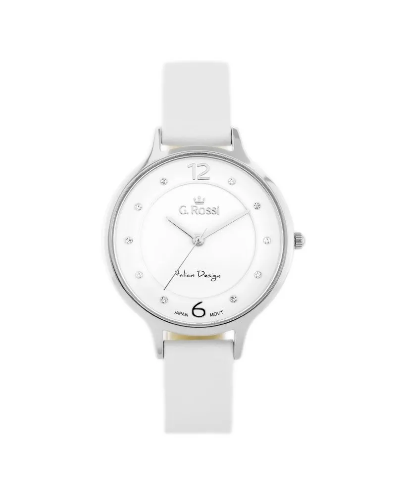 Zegarek damski G. Rossi 10411A-3C1 to doskonała propozycja dla kobiet ceniących styl, ale także praktyczność. Model wyróżnia się białym paskiem wykonanym z naturalnej skóry, który doskonale komponuje się z kopertą w srebrnym odcieniu oraz jasną, białą tarczą. Na cyferblacie umieszczono delikatne indeksy z kryształków, które subtelnie rozświetlają całość, dodając zegarkowi wyjątkowego blasku. Wodoszczelność klasy WR30 zapewnia komfort użytkowania na co dzień, chroniąc zegarek przed drobnymi zachlapaniami.
