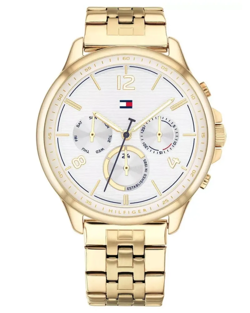 Przedstawiamy stylowy zegarek damski Tommy Hilfiger Harper 1782223, który zachwyca klasycznym połączeniem złota i granatu. Perfekcyjnie zaprojektowany, by podkreślić zarówno codzienny, jak i bardziej formalny look. Koperta oraz bransoleta wykonane zostały z trwałej, złotej stali szlachetnej, gwarantującej odporność na uszkodzenia i długotrwały blask. Srebrna tarcza z delikatnym połyskiem doskonale kontrastuje z ciemnoniebieskimi detalami, tworząc wyjątkowo harmonijną całość.