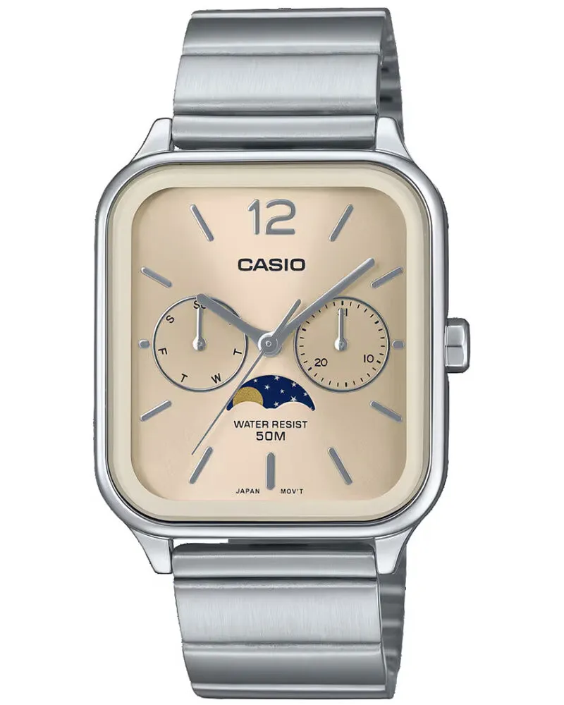Wyposażony w dokładny mechanizm kwarcowy Casio MTP-M305D-9A zapewnia precyzyjne odmierzanie czasu. Funkcja datownika pozwala na szybkie sprawdzenie aktualnego dnia miesiąca, a wskazanie faz księżyca to oryginalny dodatek dla osób ceniących praktyczne gadżety.